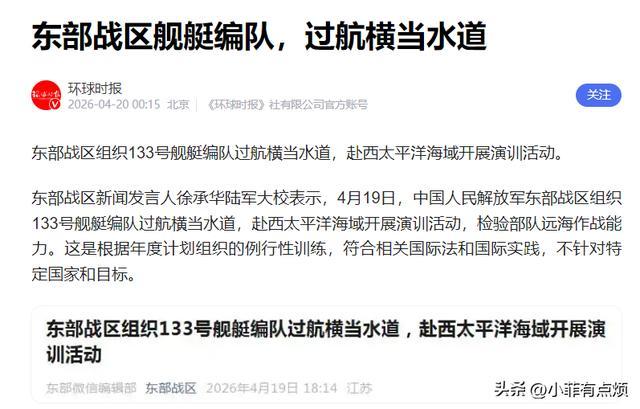 东部战区组织133号舰艇编队,直接穿过横当水道,赴西太平洋开展演训活动,这一步棋,彻底打乱了日本的算盘。