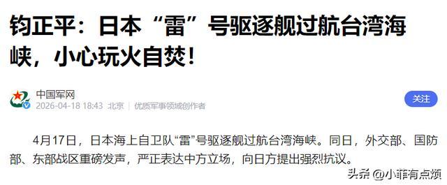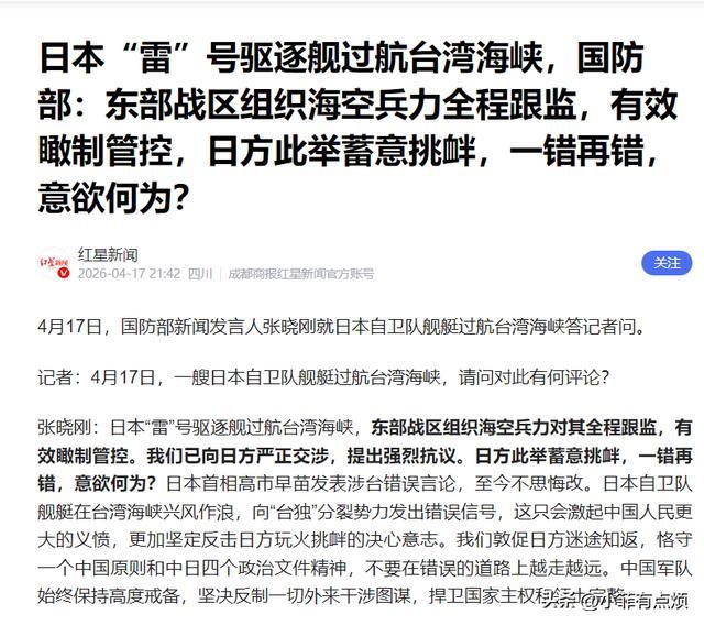 4月17日凌晨4点02分,日本海上自卫队的“雷”号驱逐舰,从台湾海峡北口慢悠悠开了进来,东部战区官宣的时候,连时间都精确到了分钟,可见早就把它的一举一动盯得死死的。